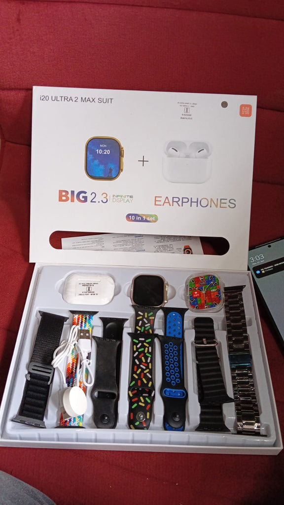 10 in1 Set Ultra Smart Bluetooth Calling Smartwatch + Earphones with Transparent Screen Guard Watch with Seven Classic Straps For Smartwatch for MEN & WOMEN Gift Product (1 Set / Mix Color)